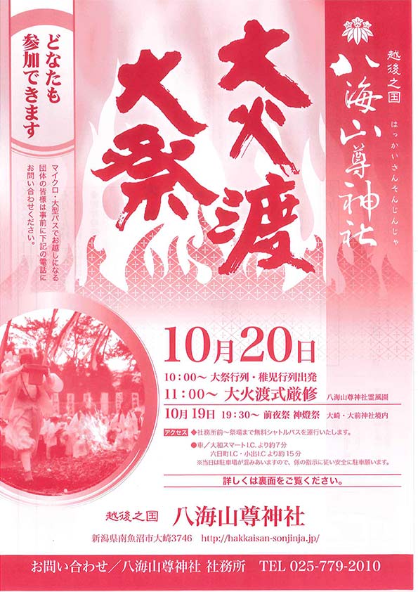 霊峰八海山登山口の大崎口里宮に行われる火渡大祭には全国から信者が訪れ、無病息災を祈って、火中を素足で渡り歩きます。